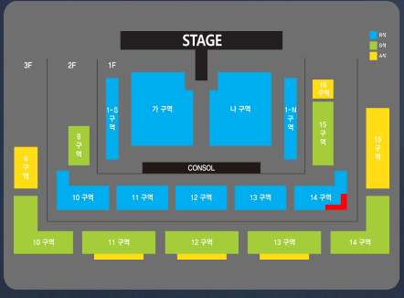 특별히 휠체어 사용자를 위한 공간으로, 2층 14구역에 빨간색으로 표시된 좌석입니다.